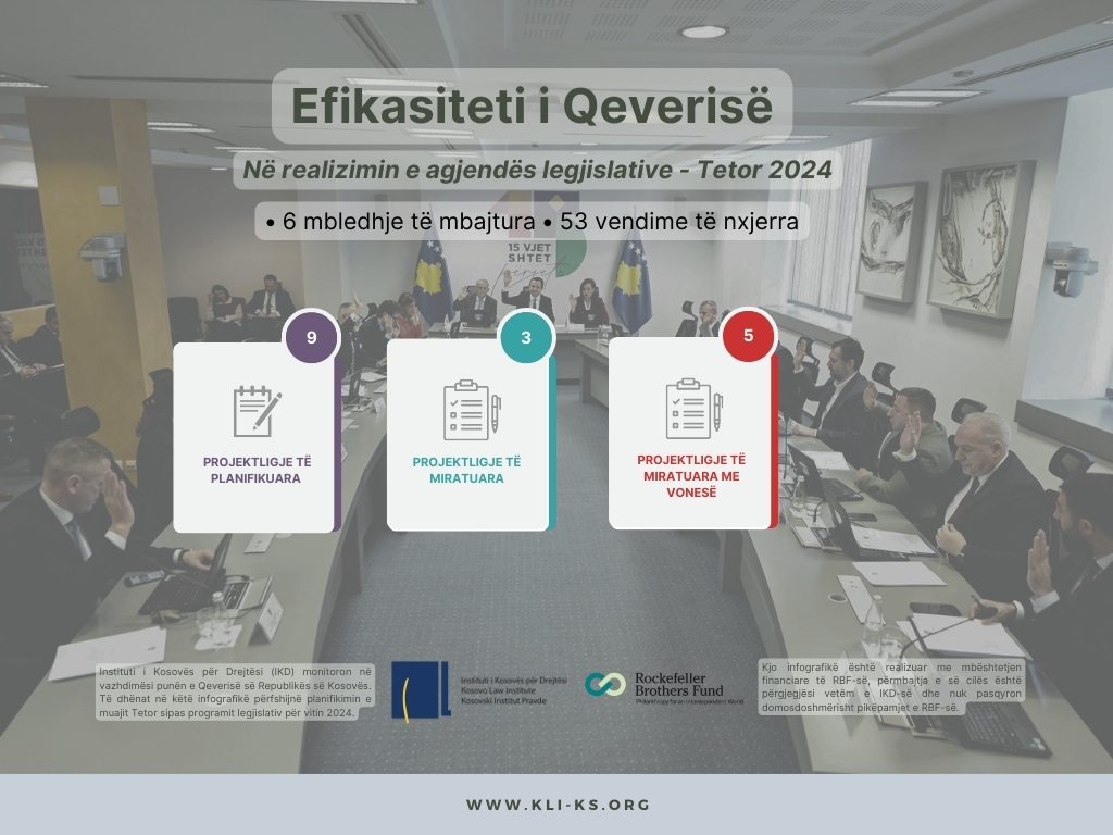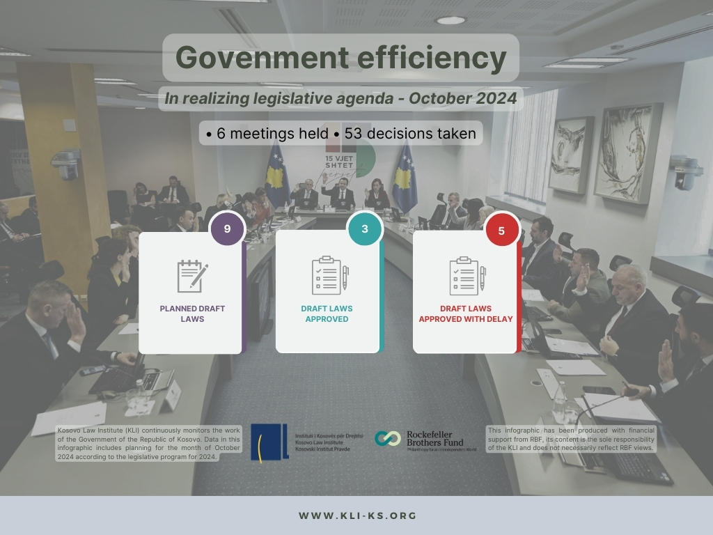 During October 2024, the Government of Kosovo held six meetings and adopted 53 decisions. In the legislative agenda for October 2024, a total of 9 draft laws were planned for approval, out of which the government approved three. Additionally, five other draft laws were approved with delays.