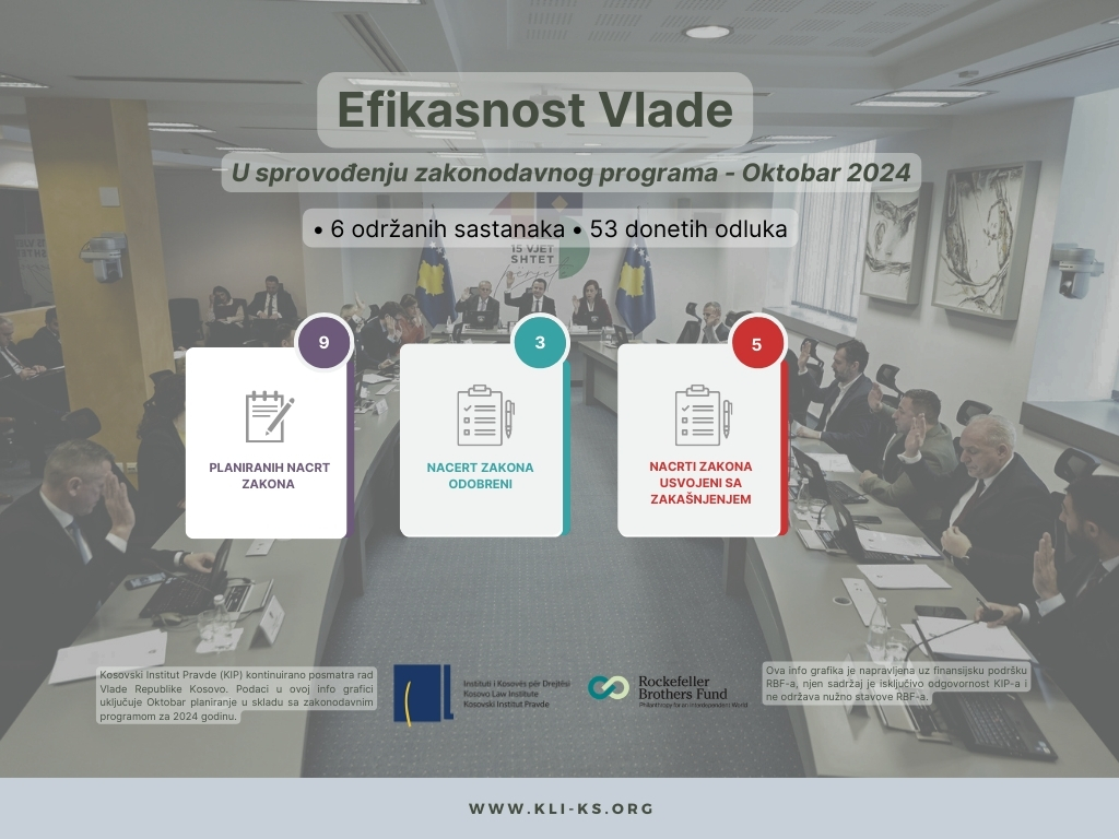 Tokom oktobra 2024. godine, Vlada Kosova održala je šest sednica i donela 53 odluke. U zakonodavnoj agendi za oktobar 2024. planirano je usvajanje 9 nacrta zakona, od kojih je vlada usvojila tri. Dodatno, pet drugih nacrta zakona usvojeno je sa zakašnjenjem.