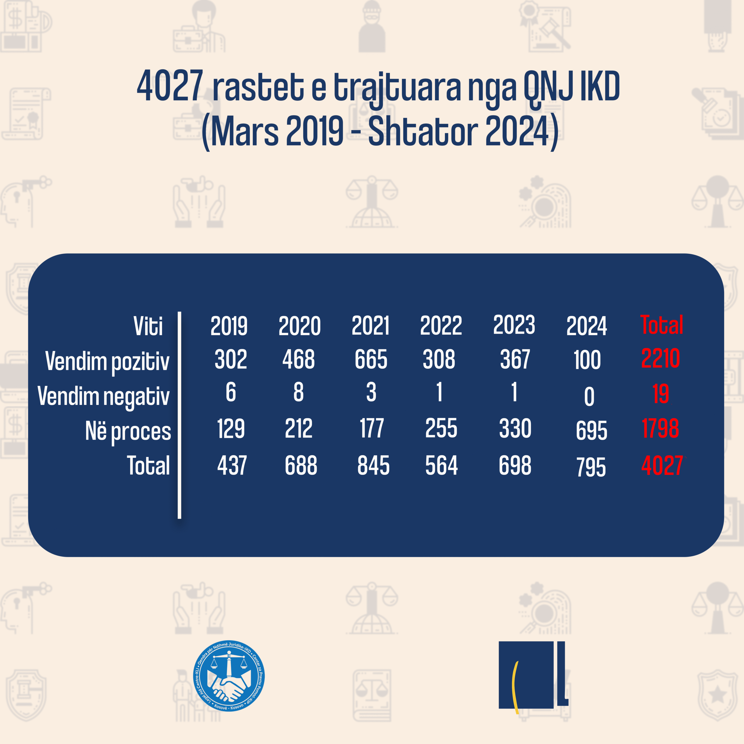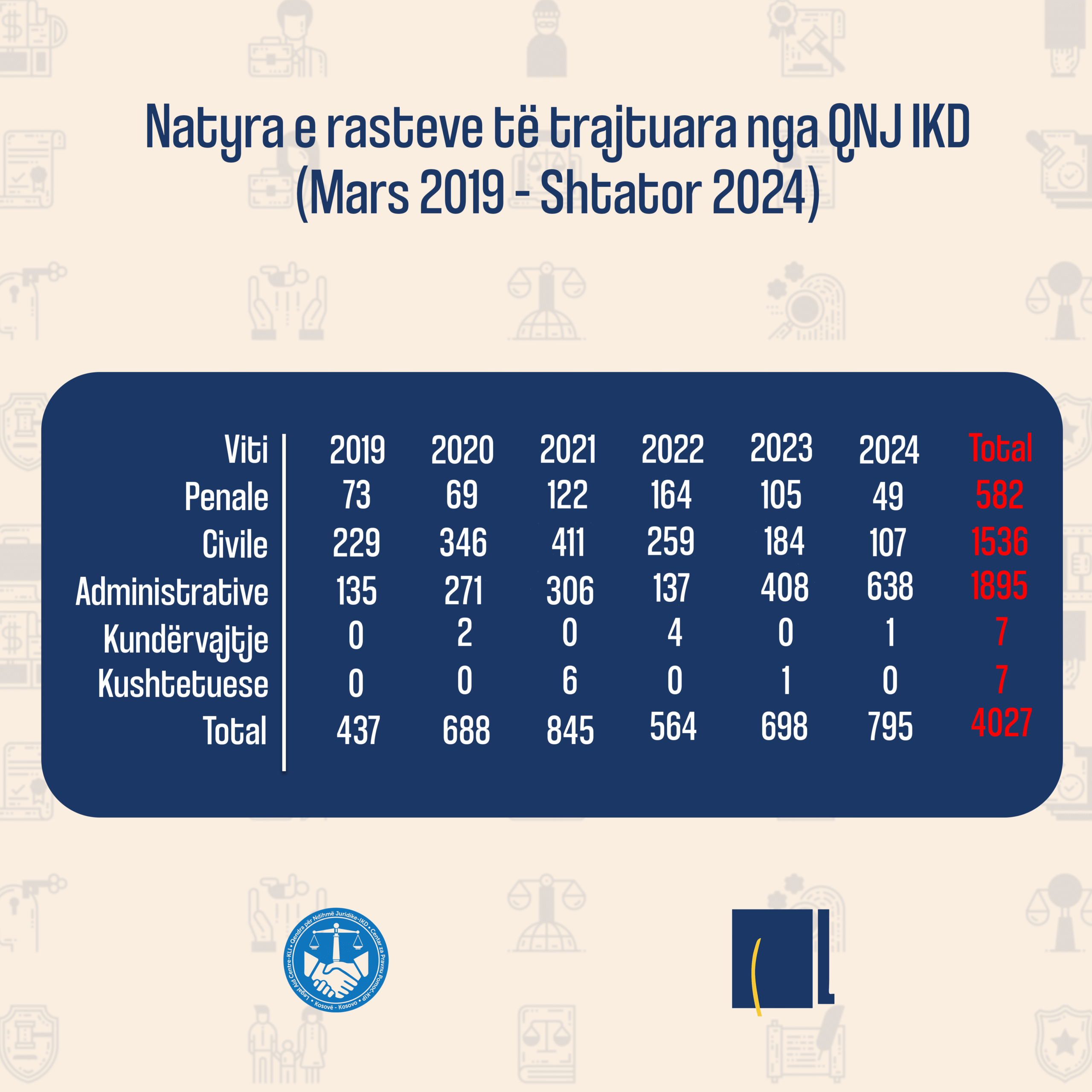 Që nga themelimi në mars 2019, e deri në shtator të vitit 2024, Qendra për Ndihmë Juridike falas e IKD-së, ka trajtuar gjithsej 4027 raste të natyrave të ndryshme. Të gjitha këto, si dhe rezultati i zgjidhjes së këtyre rasteve janë paraqitur në grafikën e sipërme dhe të mëposhtme.